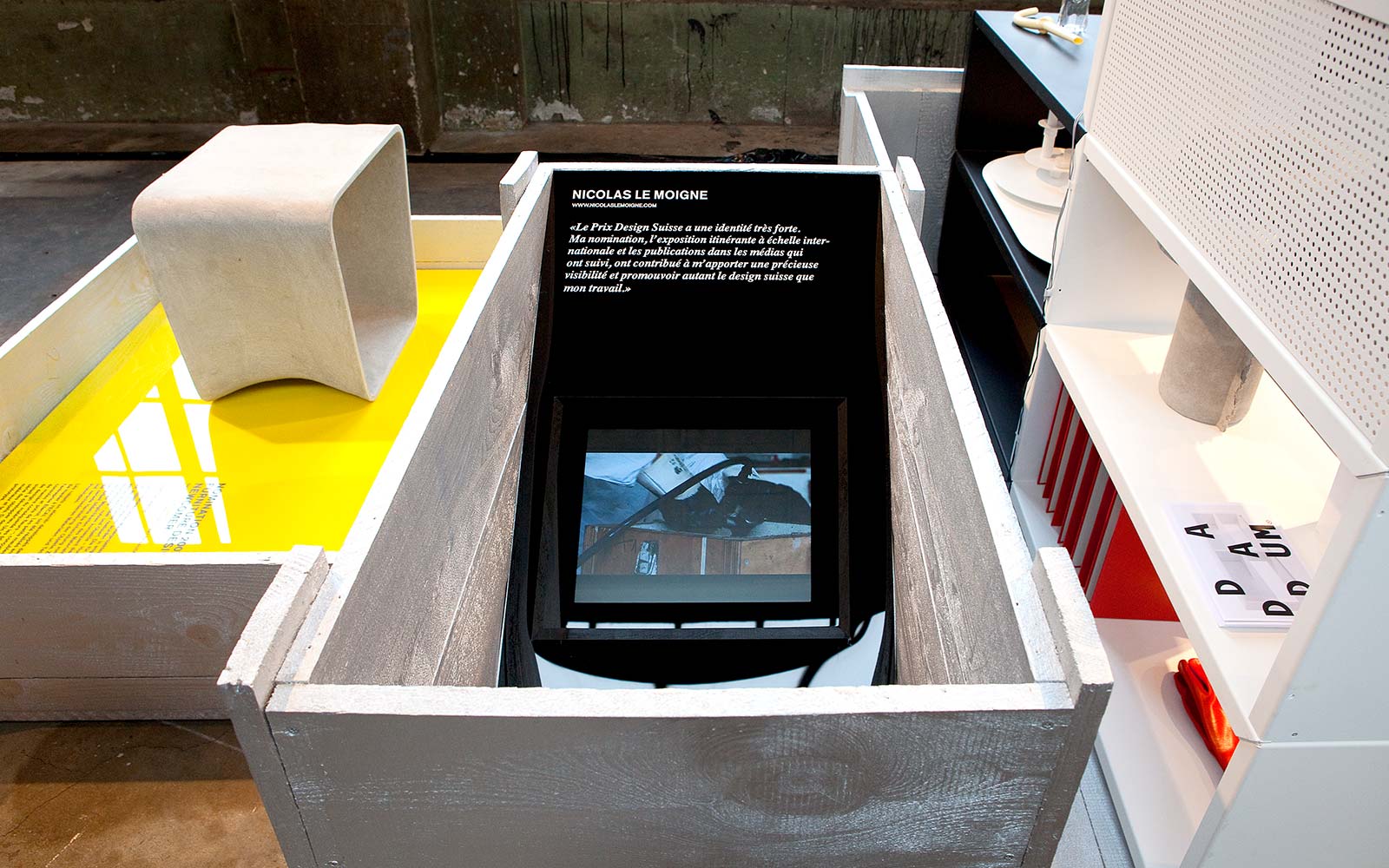 2012 – Ein Strang aus 100 gelben Messbändern durchschiesst die Industriehalle und zeichnet ein starkes Raum-Zeichen. Darunter präsentieren sich eine Auswahl für den Design Preis nominierter Gestalter mit ihren Entwürfen.