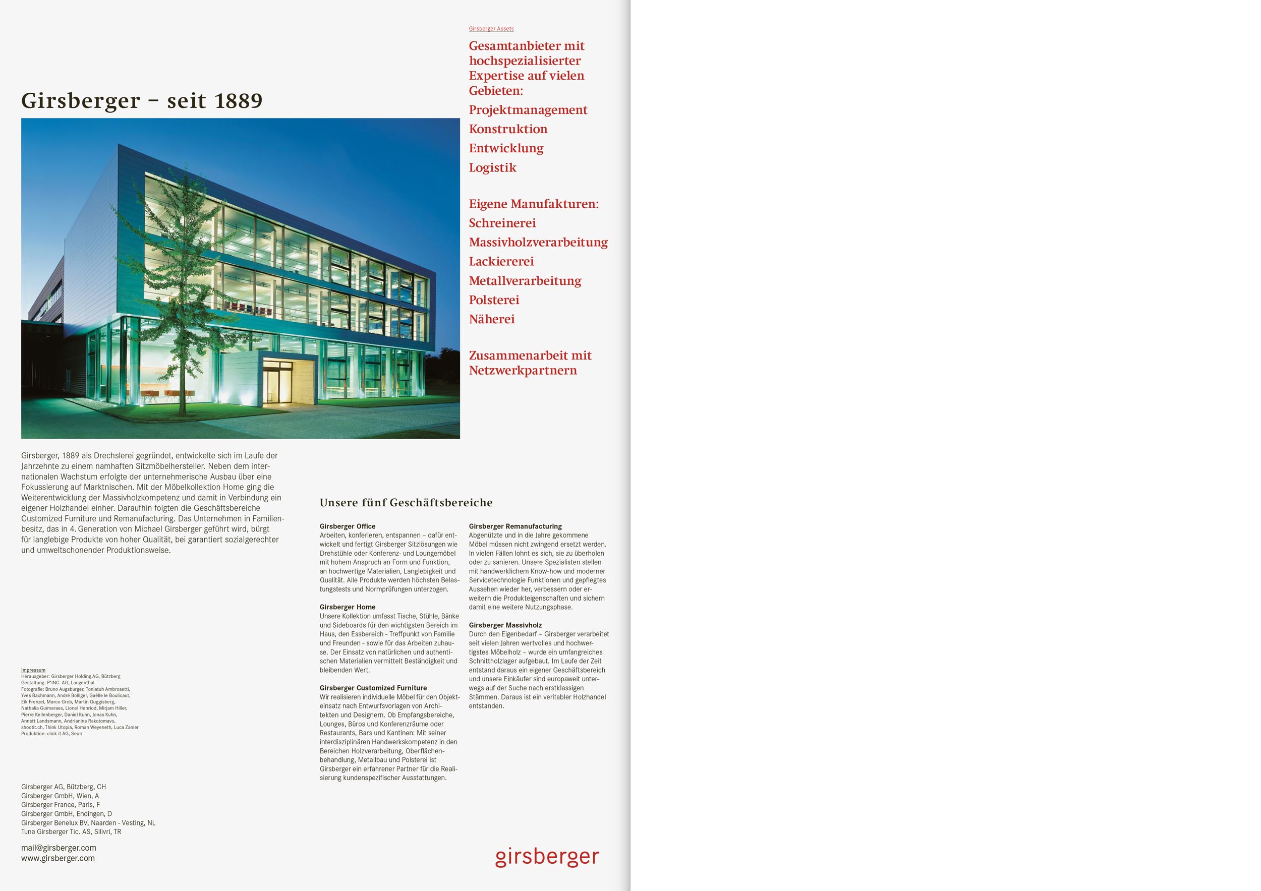 Die für Girsberger wichtigen, aber noch wenig bekannten Geschäftsbereiche «Customized Furniture» und «Remanufacturing» sollen innerhalb der Zielpublika der Architekten, Innenarchitekten und Entwerfer gestärkt werden.