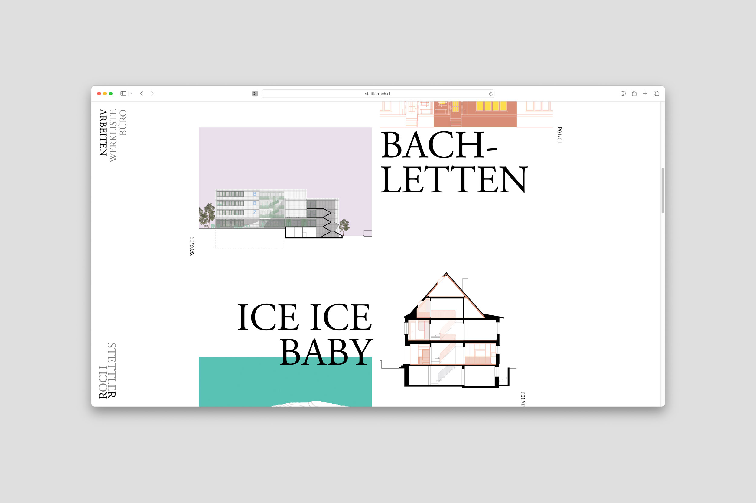 So stapeln sich heterogene Bildelemente – Entwürfe, Pläne, Schemen, Konzept- und Prozessbilder – in zwei gegenseitig zueinander scrollenden Spalten – in direkter gestalterischer Konsequenz zur vertikal gestellten Wortmarke. Sie vermitteln potenziellen Kunden Einblicke in die Arbeitsweise des Architekten-Teams, während Fachpersonen zur vertieften Auseinandersetzung eingeladen werden.